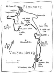 Steiermark. Die Bahn musste auf dem etwa 8 km langen Streckenteil zwischen Vordernberg und Präbichl einen Höhenunterschied von zirka 436 m überwinden.